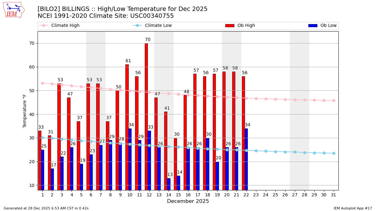 | 30 | 01 (@08) High: 33 Low: 25 Precip: 0.00 | 02 (@08) High: 31 Low: 17 Precip: 0.00 | 03 (@08) High: 53 Low: 22 Precip: 0.00 | 04 (@08) High: 47 Low: 26 Precip: 0.00 | 05 (@08) High: 37 Low: 19 Precip: 0.00 | 06 (@08) High: 53 Low: 23 Precip: 0.00 |