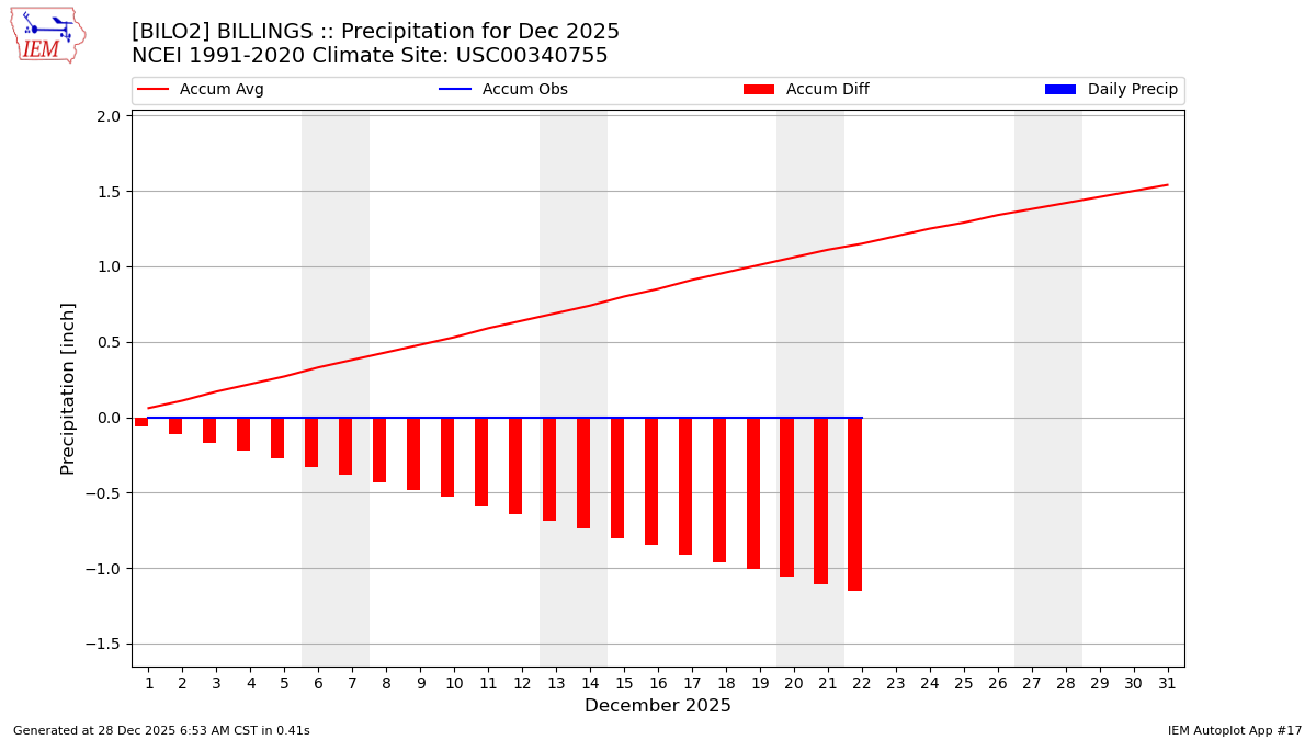 Description: This chart is of daily precipitation for the month. The red line would be an average month while the blue line and bars are observations.