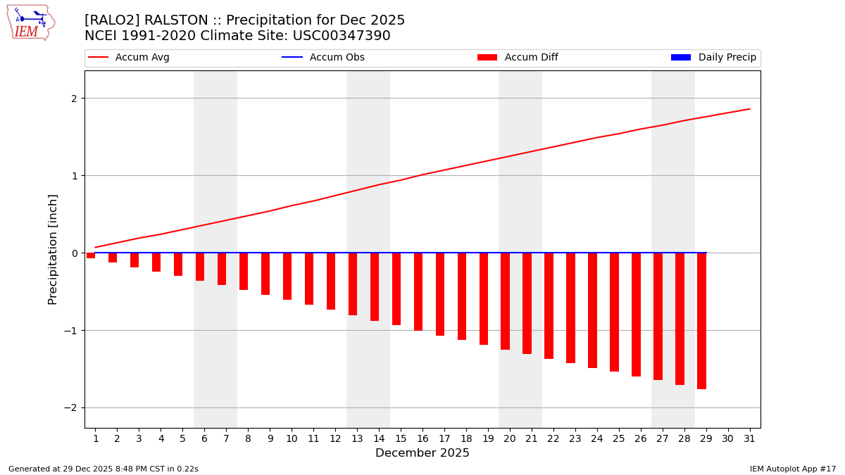 Description: This chart is of daily precipitation for the month. The red line would be an average month while the blue line and bars are observations.