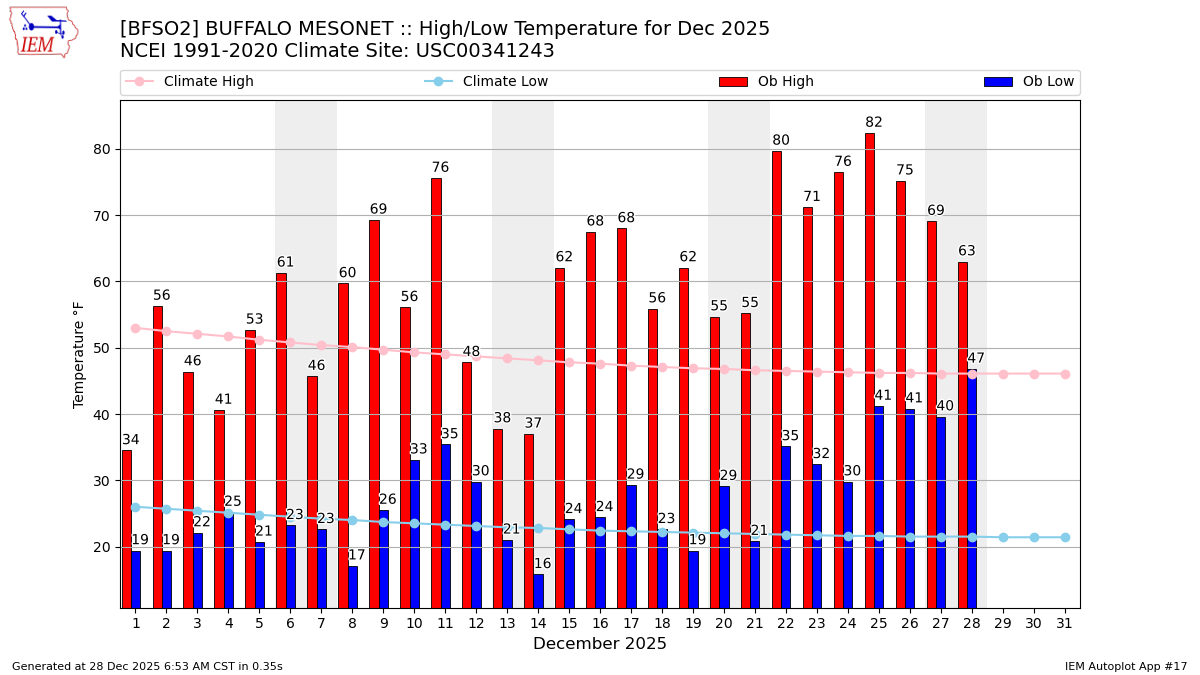 Description: This chart of the monthly temperature data. The bars are the observations and the dots are climatology.