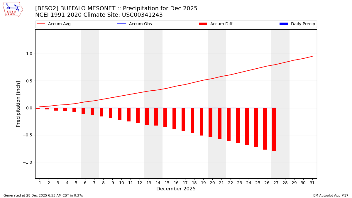 Description: This chart is of daily precipitation for the month. The red line would be an average month while the blue line and bars are observations.