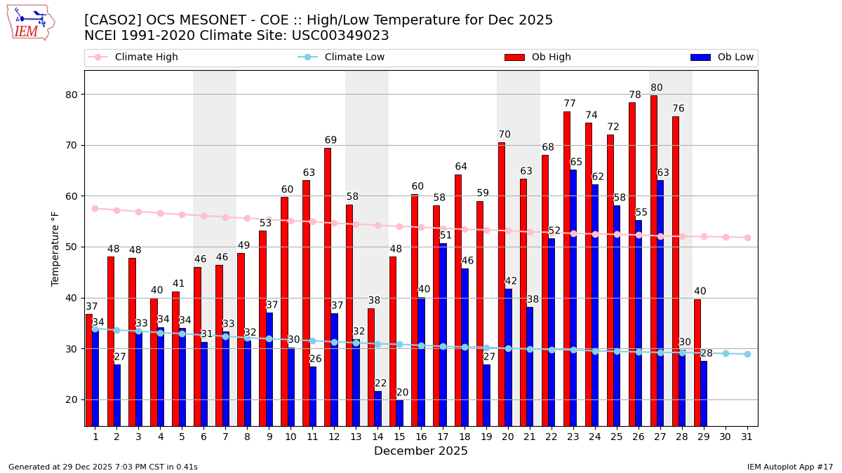 Description: This chart of the monthly temperature data. The bars are the observations and the dots are climatology.