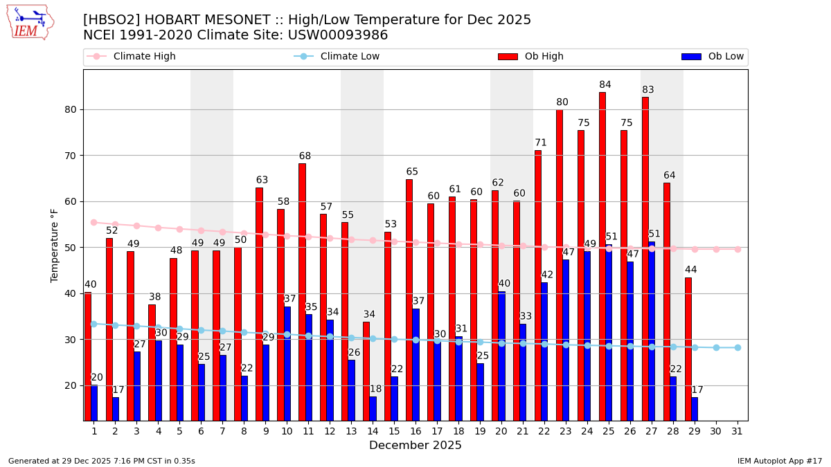 Description: This chart of the monthly temperature data. The bars are the observations and the dots are climatology.