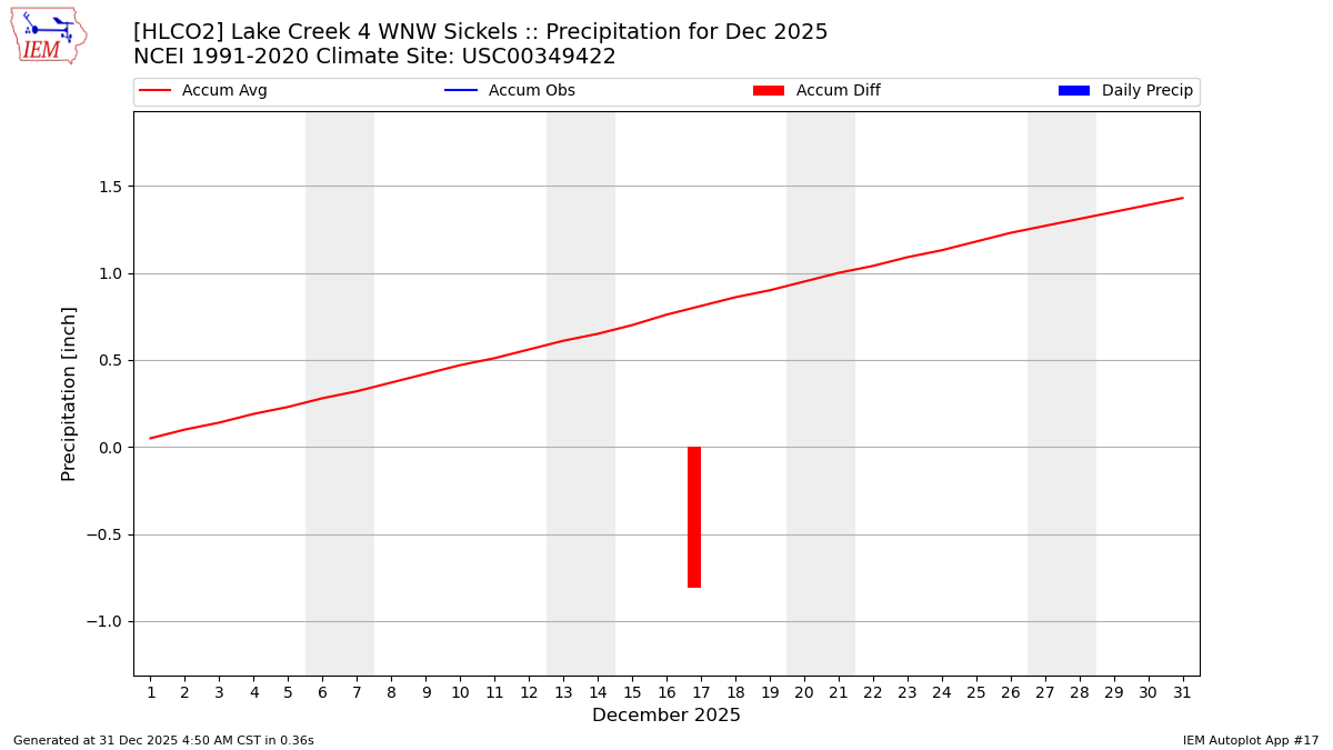 Description: This chart is of daily precipitation for the month. The red line would be an average month while the blue line and bars are observations.