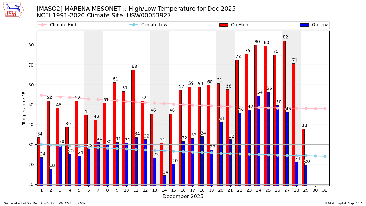 Description: This chart of the monthly temperature data. The bars are the observations and the dots are climatology.