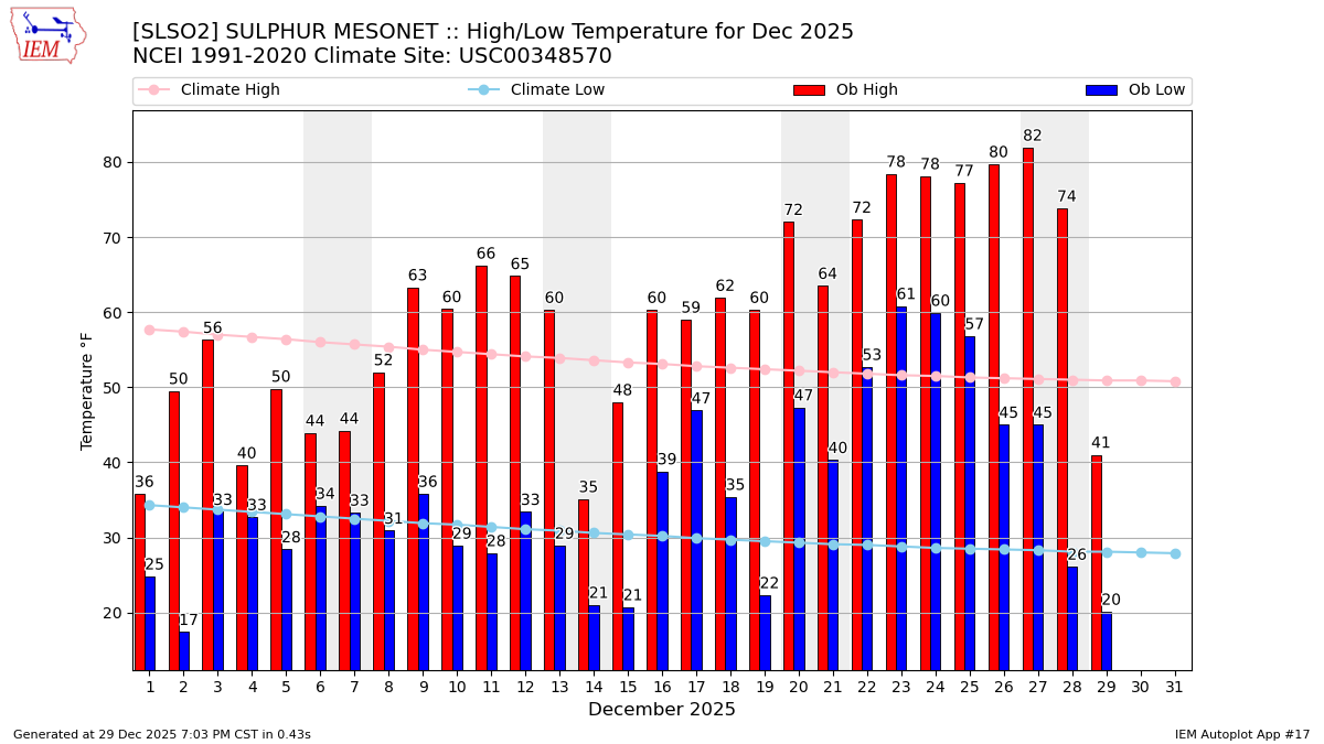 Description: This chart of the monthly temperature data. The bars are the observations and the dots are climatology.