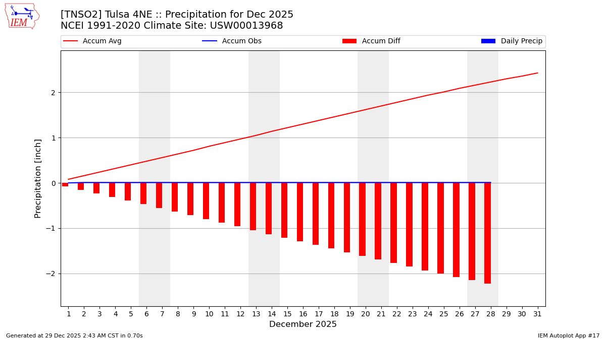Description: This chart is of daily precipitation for the month. The red line would be an average month while the blue line and bars are observations.