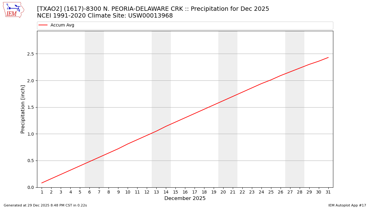 Description: This chart is of daily precipitation for the month. The red line would be an average month while the blue line and bars are observations.