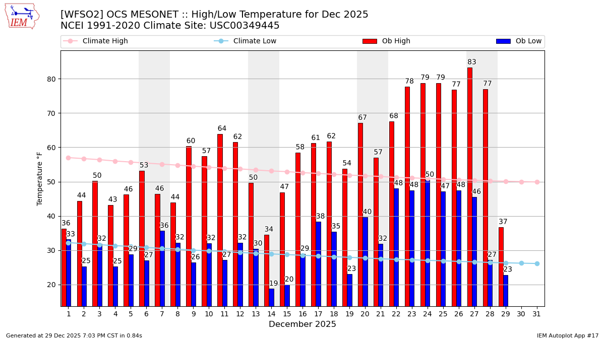 Description: This chart of the monthly temperature data. The bars are the observations and the dots are climatology.