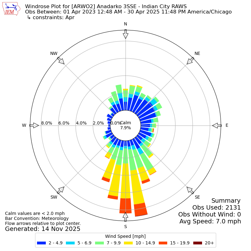 The IEM has generated these wind roses based on our archive. The archive does contain errors and non-representative data, so please use care when using these plots. In general, data from airports is of good quality and representative of the local surrounding area.