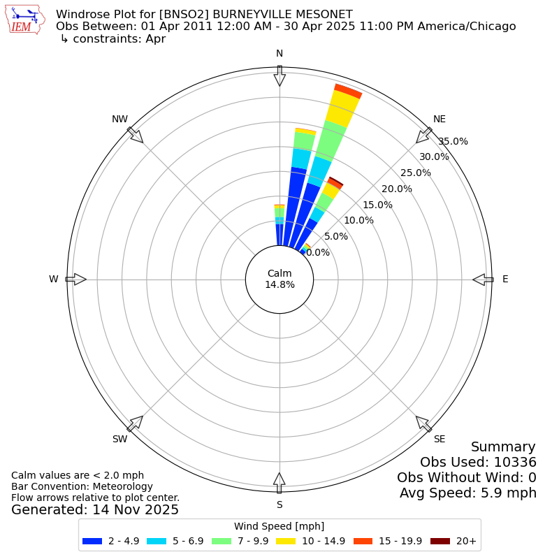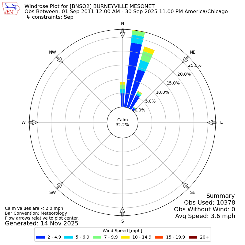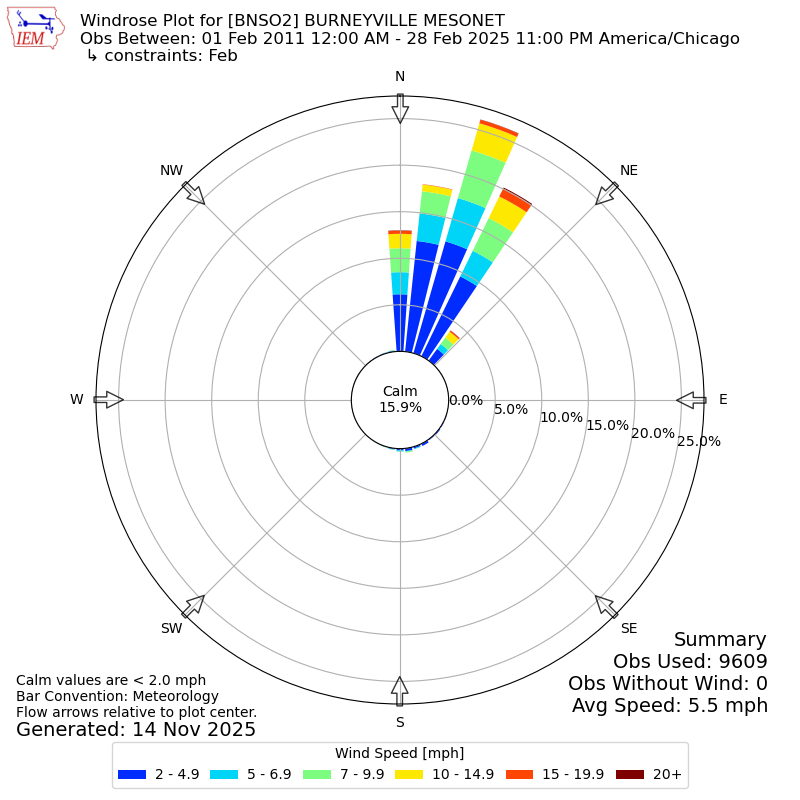 The IEM has generated these wind roses based on our archive. The archive does contain errors and non-representative data, so please use care when using these plots. In general, data from airports is of good quality and representative of the local surrounding area.