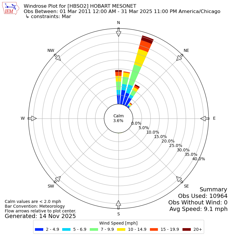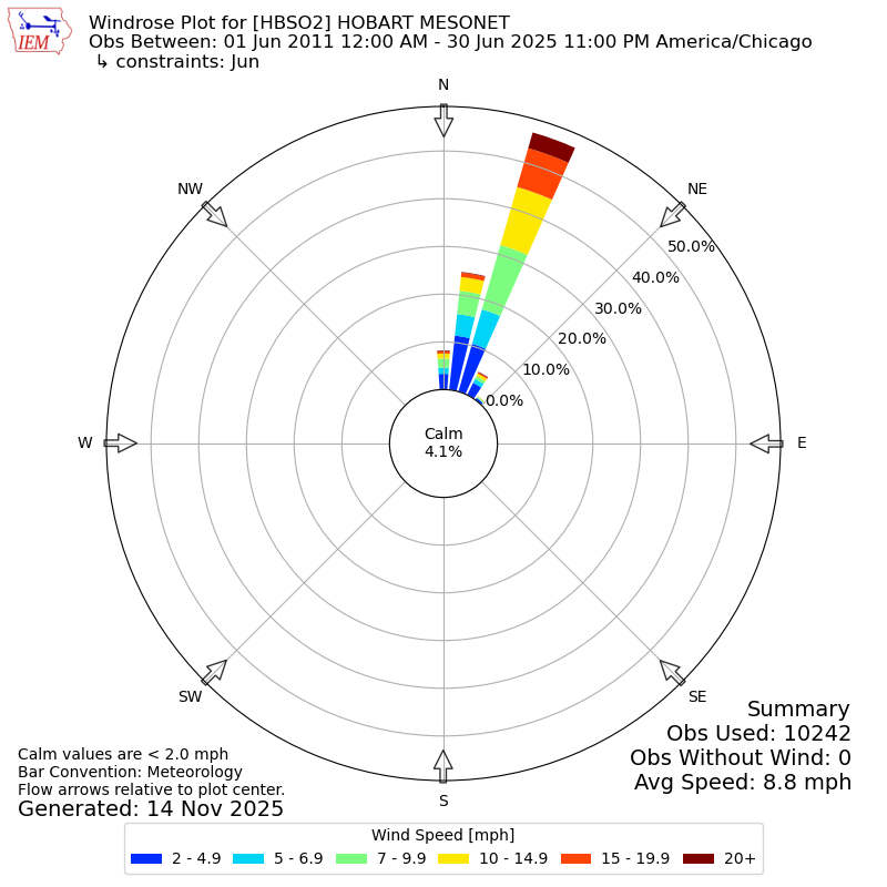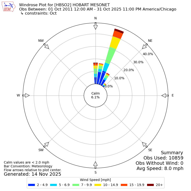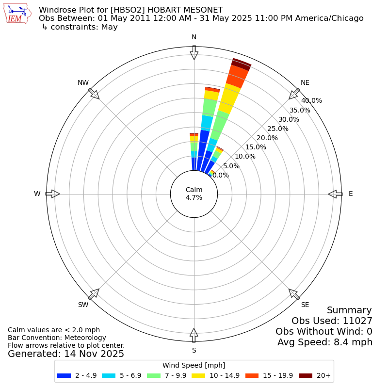 The IEM has generated these wind roses based on our archive. The archive does contain errors and non-representative data, so please use care when using these plots. In general, data from airports is of good quality and representative of the local surrounding area.