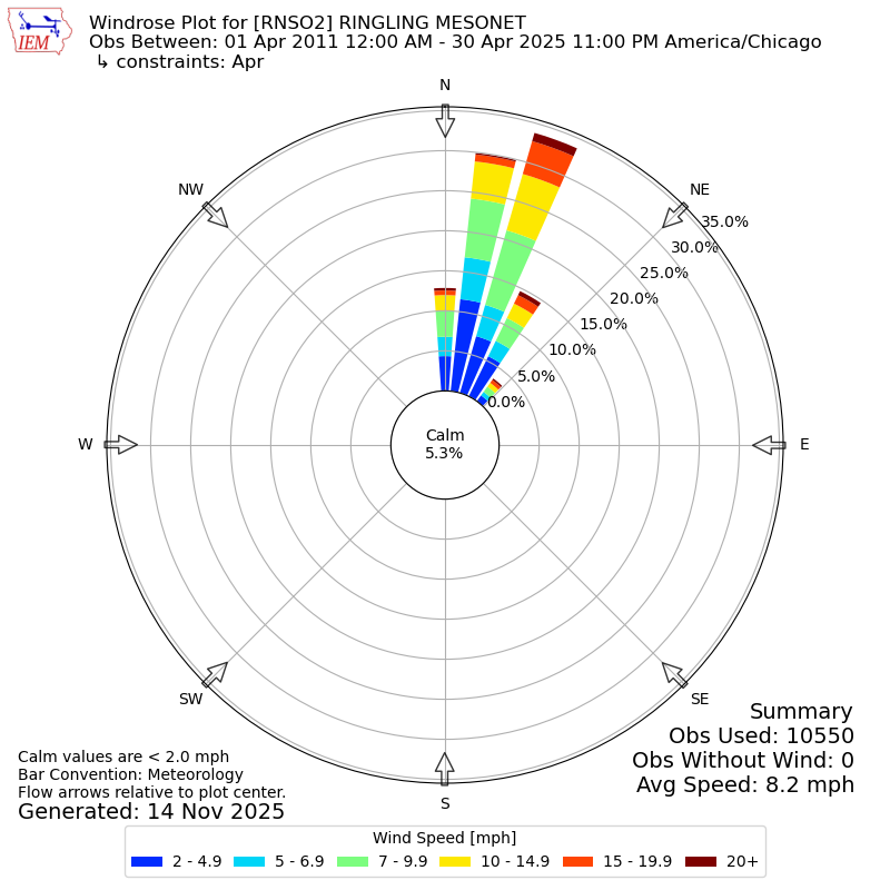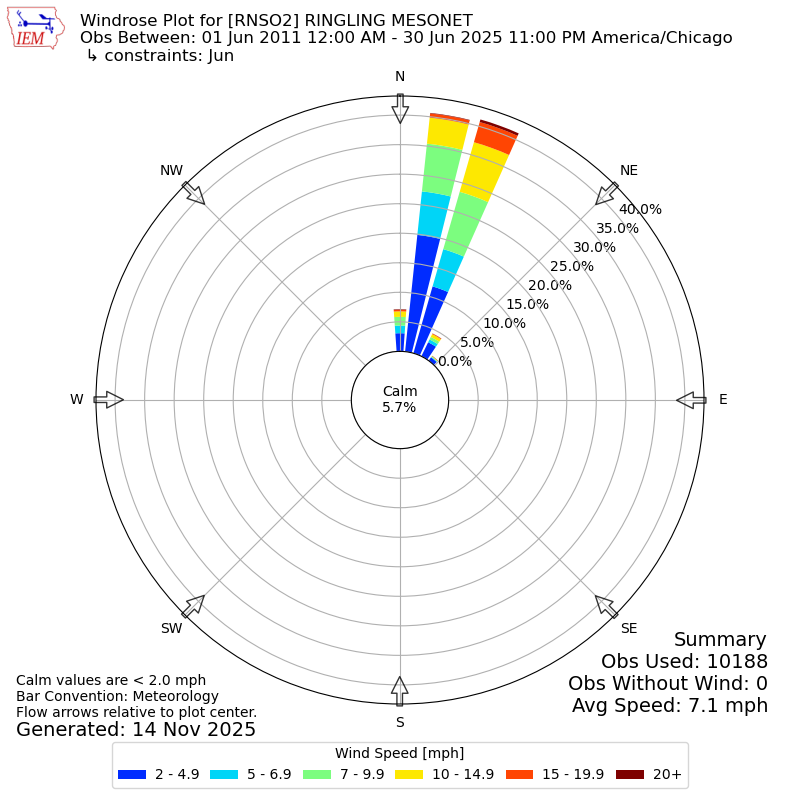 The IEM has generated these wind roses based on our archive. The archive does contain errors and non-representative data, so please use care when using these plots. In general, data from airports is of good quality and representative of the local surrounding area.