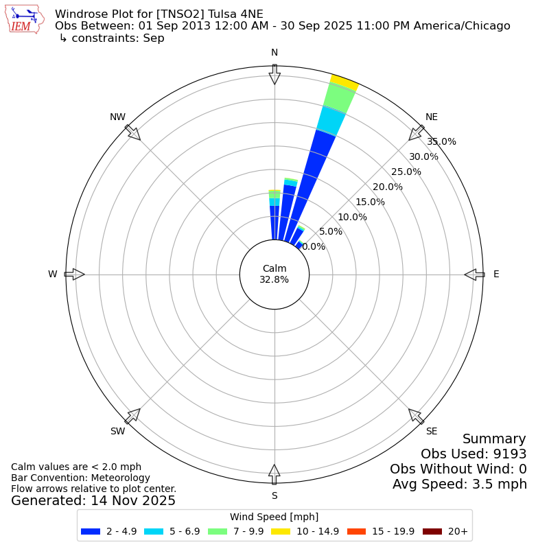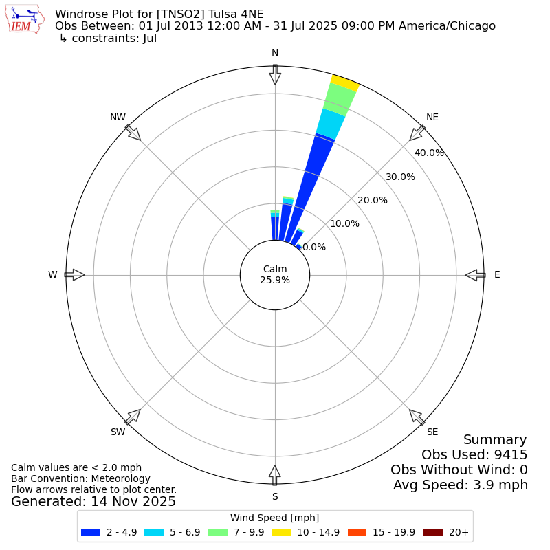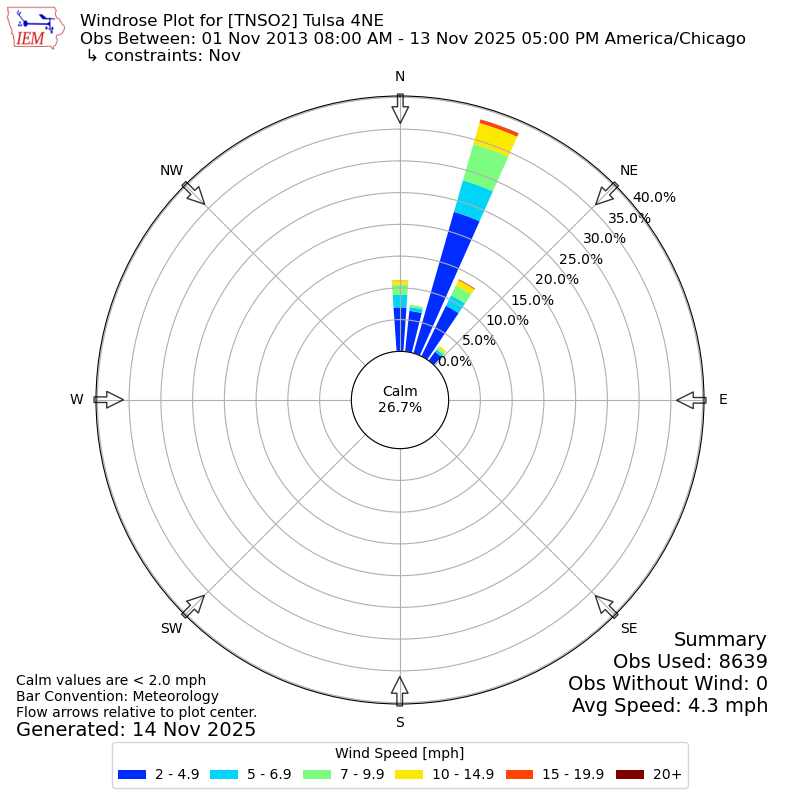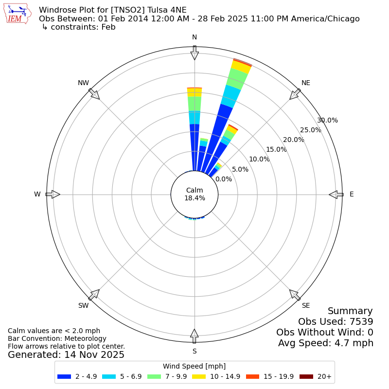 The IEM has generated these wind roses based on our archive. The archive does contain errors and non-representative data, so please use care when using these plots. In general, data from airports is of good quality and representative of the local surrounding area.