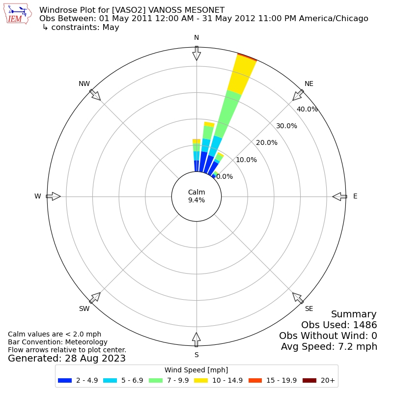 The IEM has generated these wind roses based on our archive. The archive does contain errors and non-representative data, so please use care when using these plots. In general, data from airports is of good quality and representative of the local surrounding area.